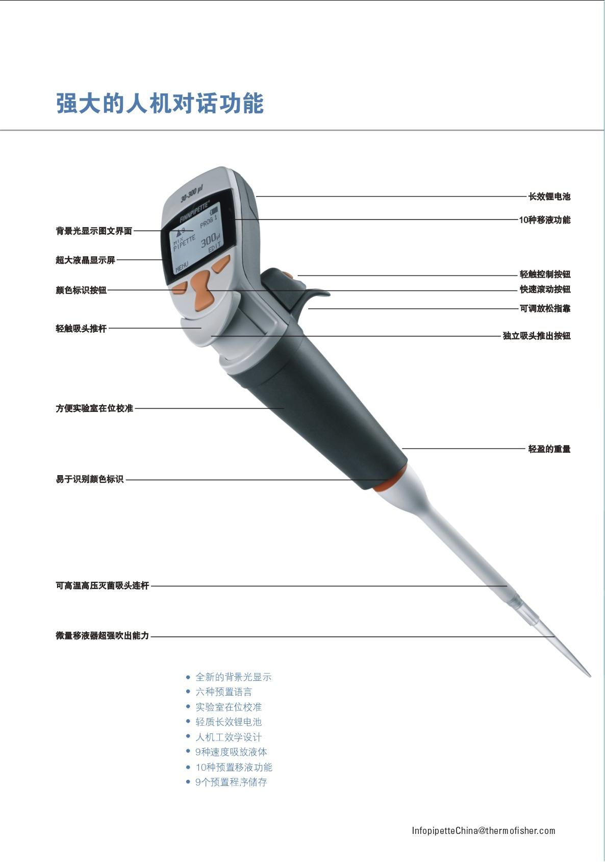 Finnpipette Novus是世界上唯一一支提供多種語言界面的電動移液器。提供包括英語、法語、意大利語、德語、西班牙語在內的六種語言界面的移液器。可以方便從“OPTAIN”菜單更換語言界面。最新提供全中文版本,特別適合中國用戶使用。